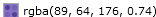 The advanced color picker uses RBG values to define the color, as well as an A (Alpha) setting to specify the transparency of the color in the range of 0–100, where 0 is transparent and 100 is solid. When the alpha setting is anything other than 100, the color is defined in the format with the alpha setting appearing as a percentage.