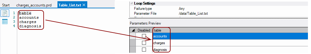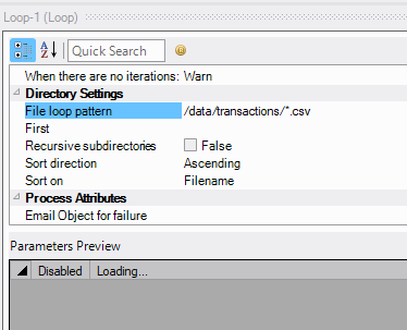 When using a file loop pattern, parameters are not available for editing as they are limited only to the values shown in the preceding table. For this example, three files in the /data/transactions folder is a parameter in the loop. The accounts_final.txt file is not a parameter as it is not a .csv file.