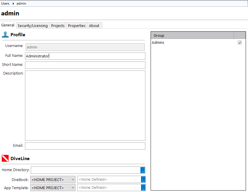The Users tab displays a list of the current users on this DiveLine connection. You can manually resize most columns for readability. From this tab, you can review the following user information: